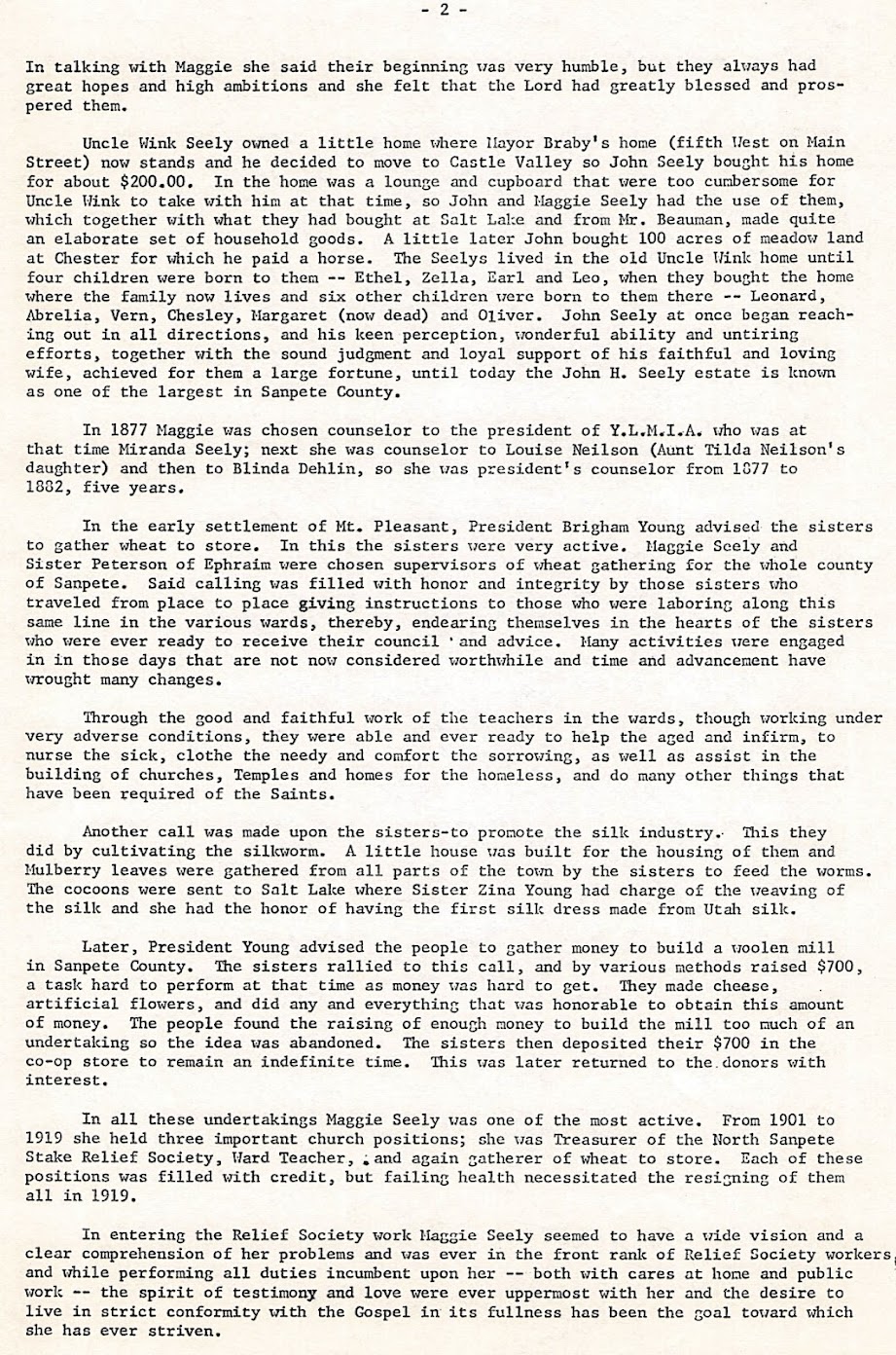 John Henry Seely and Margaret Folkman Peel were married in the Endowment House in Salt Lake City on 15 January 1880. They had known each other most of their lives. Both were raised in Mt. Pleasant of pioneer parents. Margaret's parents, Peder Madsen Peel and Christiana Folkman Peel, were Danish converts who came to Utah in 1854 and settled in Lehi, Utah where she was born 1 March 1858. They were later sent to Mt. Pleasant to colonize and lived there the rest of their lives.